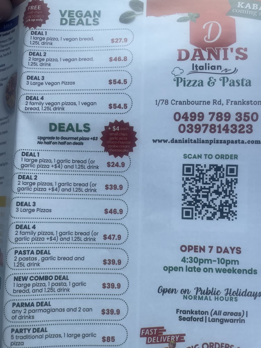 Welcome to Danis Italian Pizza and Pasta, celebrated as the best pizza spot in Frankston. Nestled at 1/78 Cranbourne Rd, this charming eatery has quickly become a local favorite for its mouthwatering offerings. The menu highlights include a range of traditional and innovative pizzas, with exceptional vegan options that cater to diverse dietary preferences.